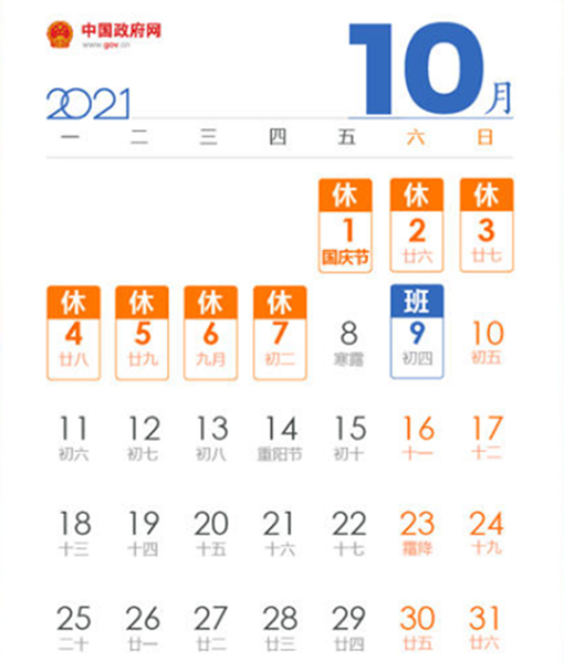 根据国务院办公厅关于2021年节假日安排,现将本公司国庆节放假安排通知如下:
