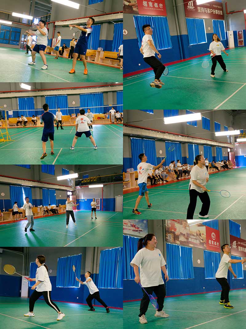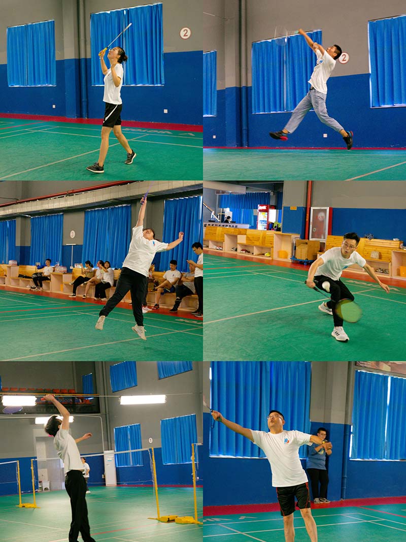 抽签结束后,工会主席张小弟宣布比赛开始,首先上场的是两组男单和两组女单,分四个赛场同时进行,换上运动装的华杰小伙伴,个个变成了活力四射的运动员。参与型的,尽自己的最大努力一个一个球的奋勇拼博;水平好的,将高远球、扣杀、劈杀、吊球等各种战术、各路球技展现得淋漓尽致。