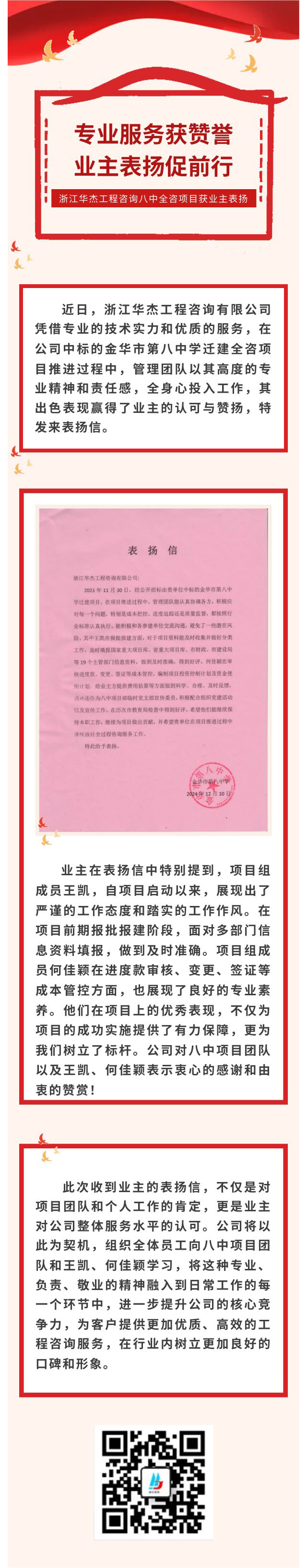 专业服务获赞誉,业主表扬促前行 ——浙江华杰工程咨询八中全咨项目获业主表扬